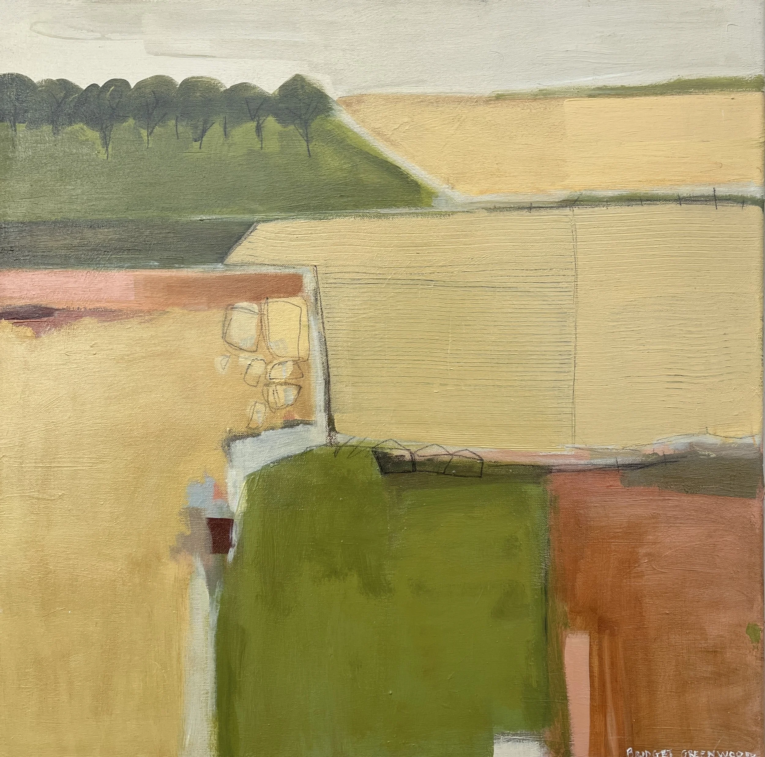 Bridget Greenwood (b. 1961, Cheshire, UK) is a contemporary painter whose work explores the relationship between people and landscape through semi-abstract compositions. Her work reduces fields, horizons and pathways to simplified forms and subtle colour relationships, reflecting on memory, atmosphere and human presence in the landscape.