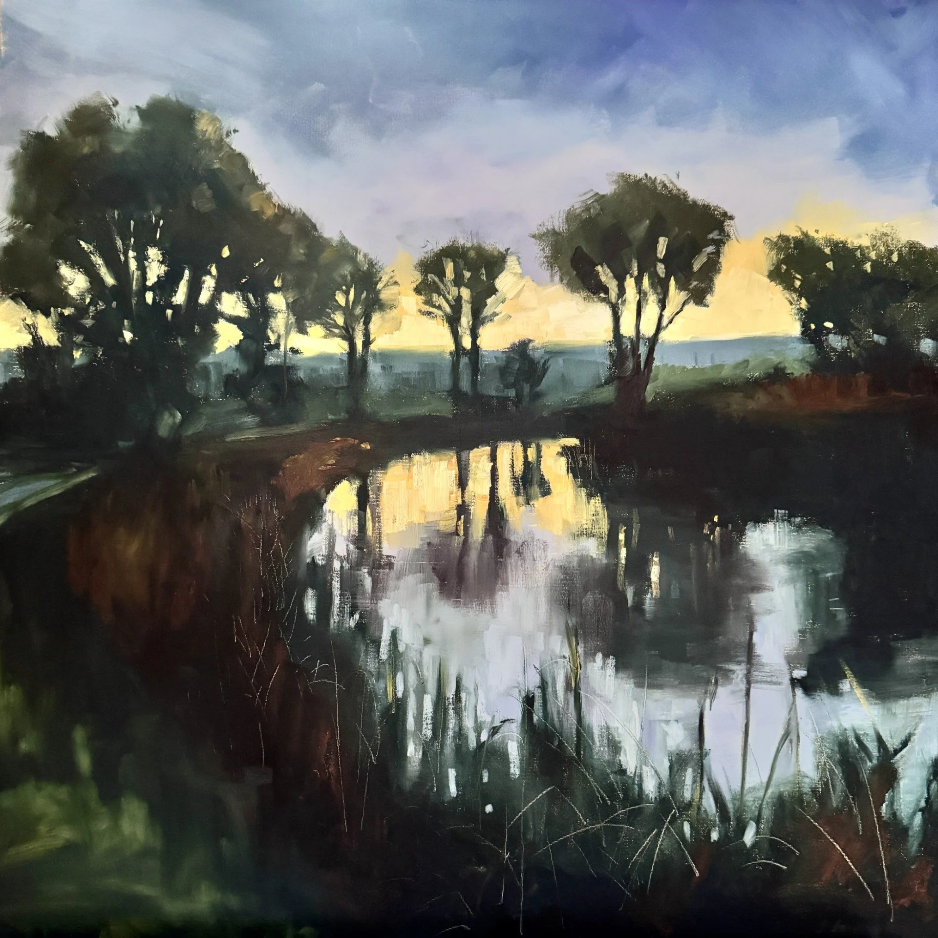 Kirsten Elswood’s primary interests are landscape and still-life painting and each has a separate focus for her. With landscape, she explores atmosphere and composition - she tries to capture the ‘peace of the wild’ - the feeling of being out in the land with its weather changes, energy, scent and light. She does this by regularly going out painting and sketching ‘en plein air’ - developing these works further in the studio. She particularly enjoys strong contrast and working with contre-jour - with the sun behind the subject, to create drama and interest.