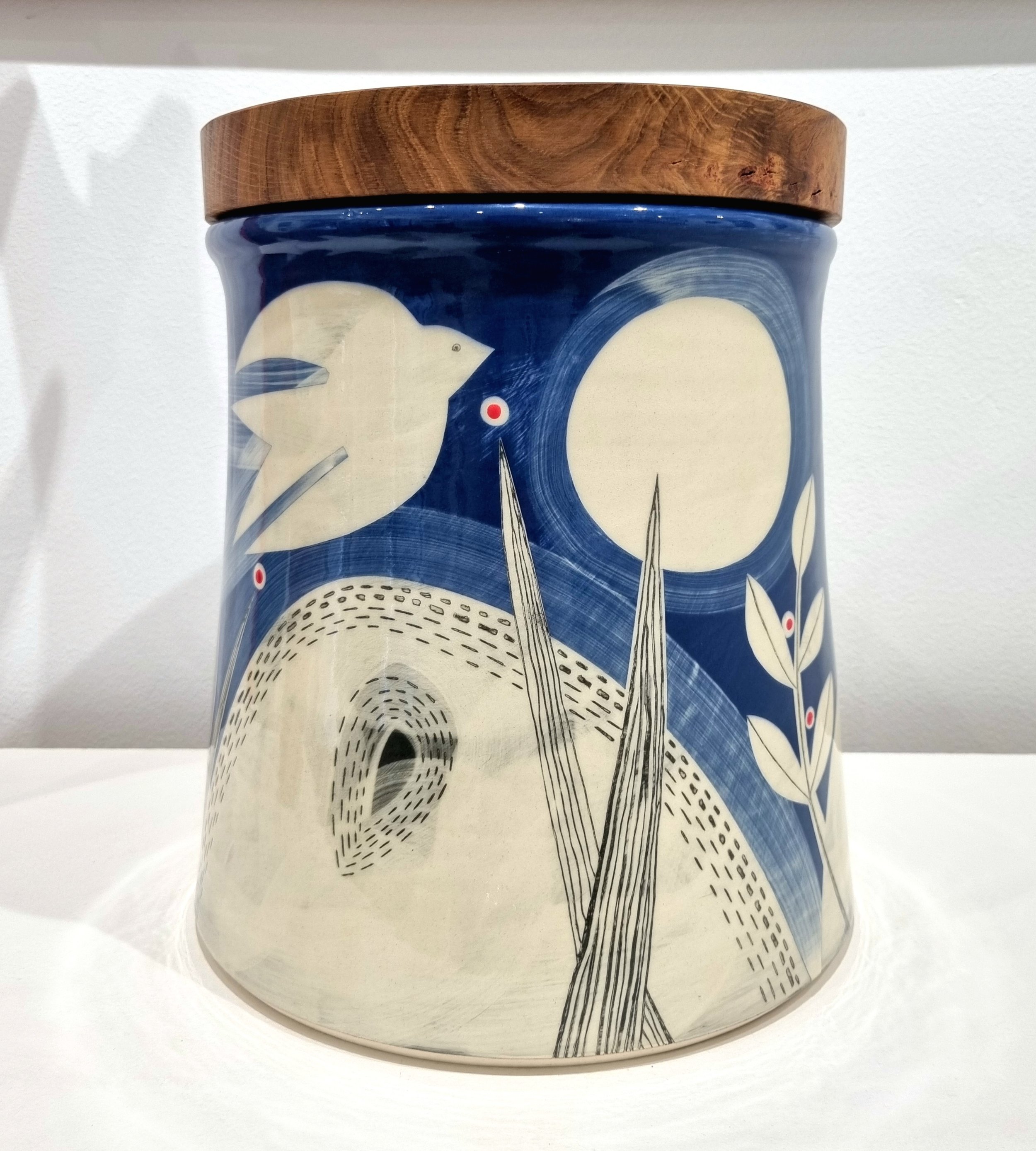 Alice - My approach to painting the pots has evolved over the years that Roop and I have been working together. Inspiration comes from the natural world and, in turn, this is abstracted into various patterns and motifs found on the pots. I mostly use coloured slips to paint with and these are built up in layers using different brushstrokes when the pots are still wet. This allows for a certain fluidity and a sense of movement within the designs. I like to treat all the pots individually, working on them like drawings.