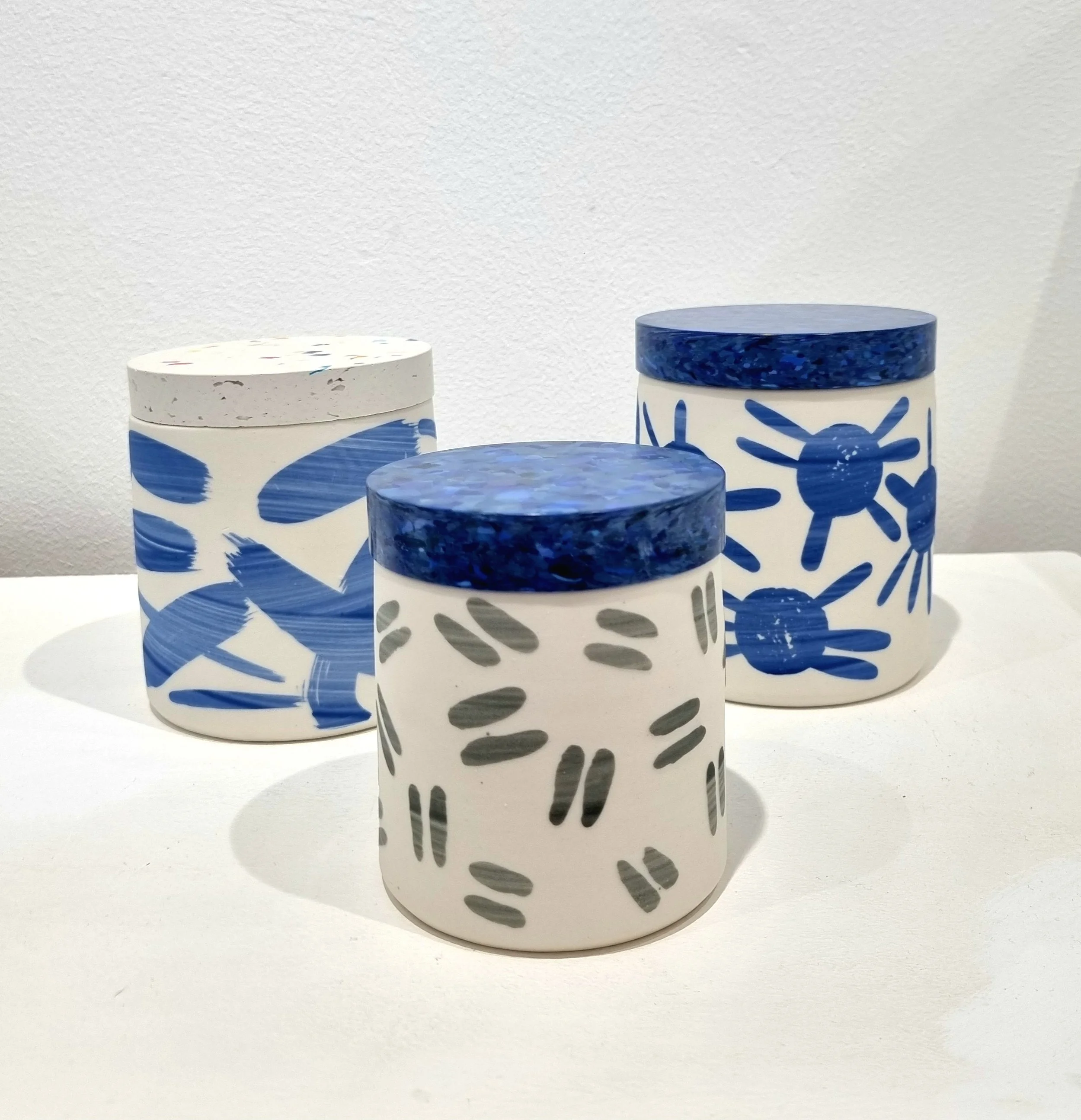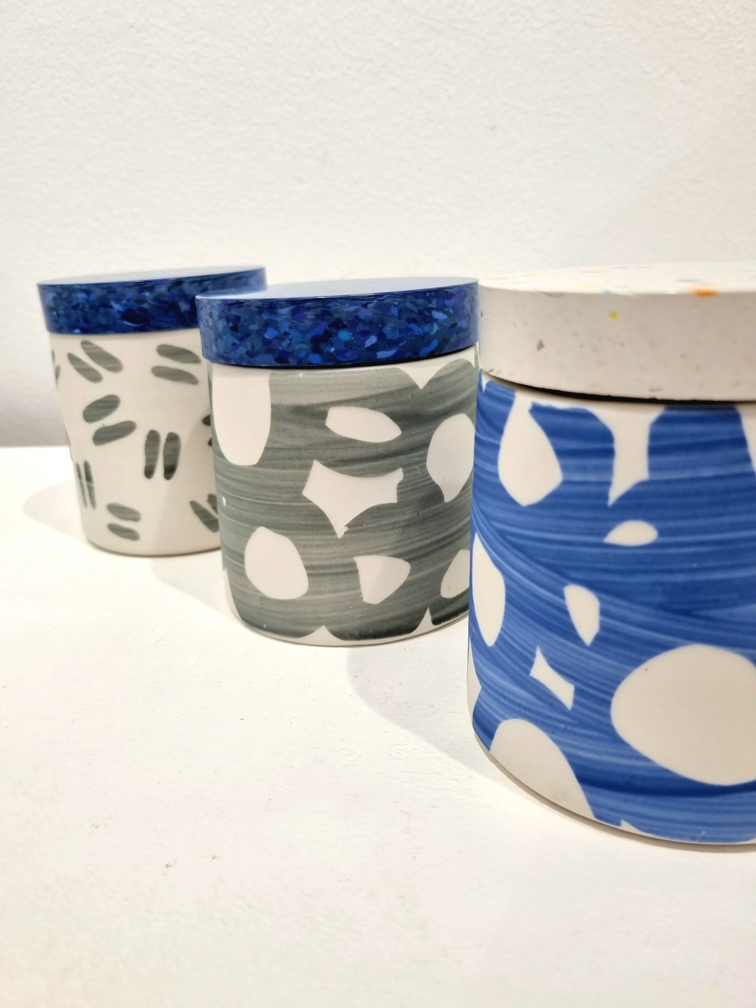 Thrown Porcelain with resist slip pattern work, glazed inside and a recycled plastic lid.